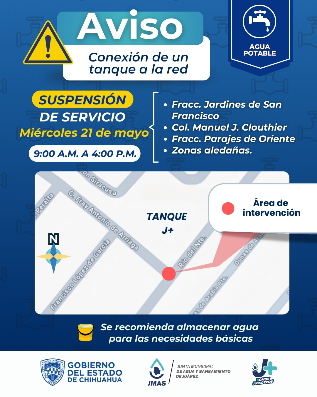 Durante este horario, se presentará falta de servicio de agua potable en los fraccionamientos Parajes de Oriente y Jardines de San Francisco, así como en la colonia Manuel Jesús Clouthier y zonas aledañas.