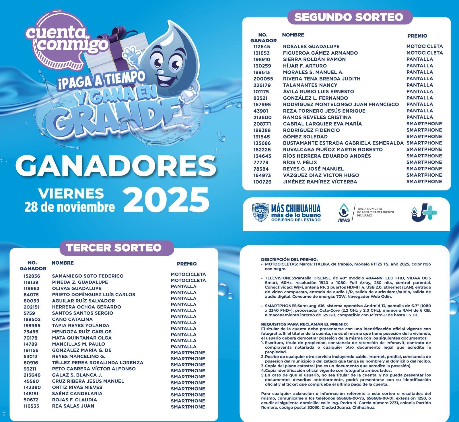 La lista oficial de ganadores ya se encuentra disponible para consulta en las redes sociales y en la página www.jmasjuarez.gob.mx, donde cada participante puede verificar si fue uno de los afortunados.