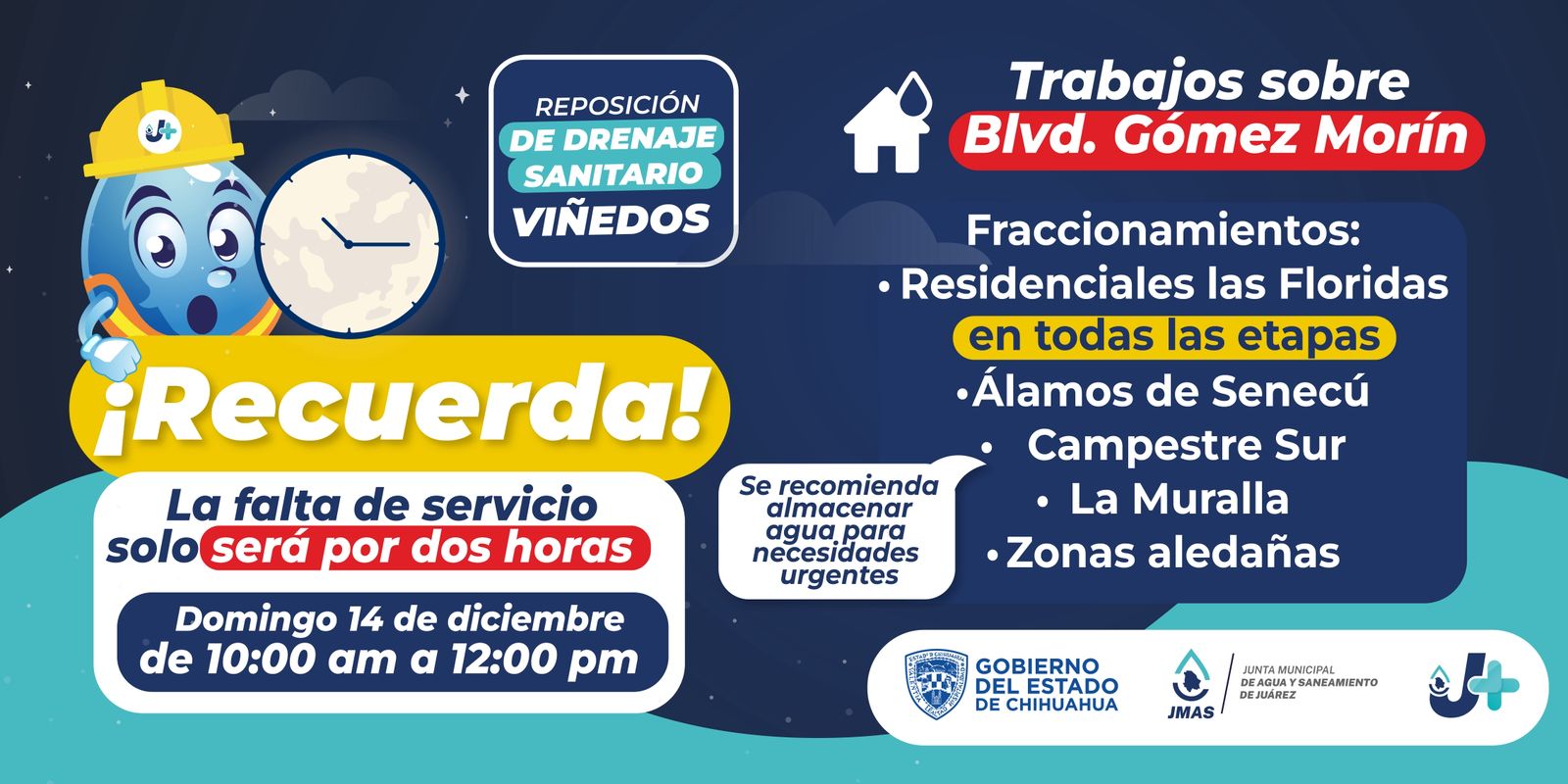 Debido a los trabajos de reposición del colector Viñedos, la J+ informa que, habrá suspensión o baja presión en el servicio, el domingo 14 de diciembre de las 10 de la mañana a las 12 del mediodía, en los siguientes fraccionamientos: Residenciales Las Floridas (todas sus etapas), Álamos de Senecú, Campestre Sur, La Muralla y zonas aledañas.