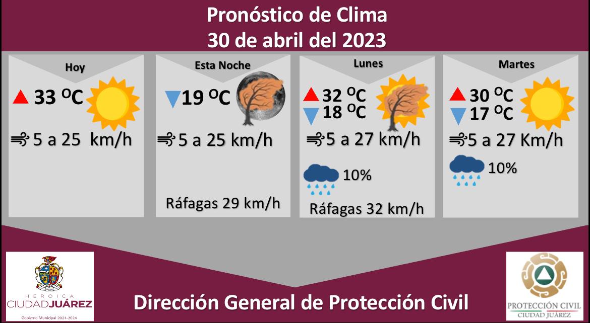 Para hoy se espera un día soleado con una temperatura máxima de 33 °C y mínima de 19 °C, la velocidad del viento será de 5 a 25 kilómetros por hora.