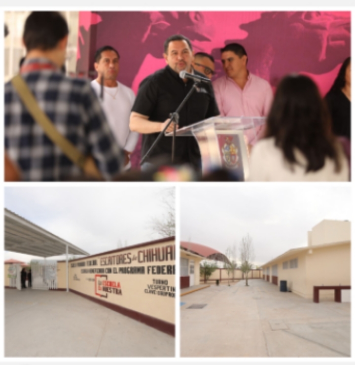 Este día, el Presidente Municipal, Cruz Pérez Cuéllar, entregó la rehabilitación de la Escuela Primaria Escritores de Chihuahua, ubicada en el bulevar Fundadores y Prolongación Santiago Troncoso en Urbivilla Villa Bonita.
