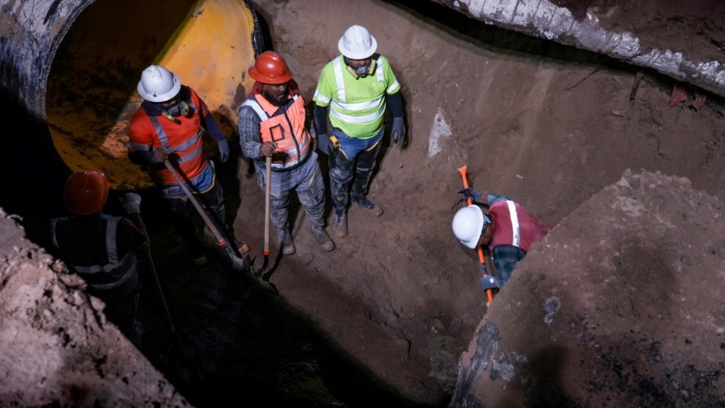 Durante la noche del jueves y la madrugada de este viernes, la J+ inició con los trabajos de sellado del antiguo colector Cuatro Siglos, el cual es rellenado con concreto para así reducir el riesgo de hundimiento en el bulevar y cancelar por completo la red antigua de drenaje.