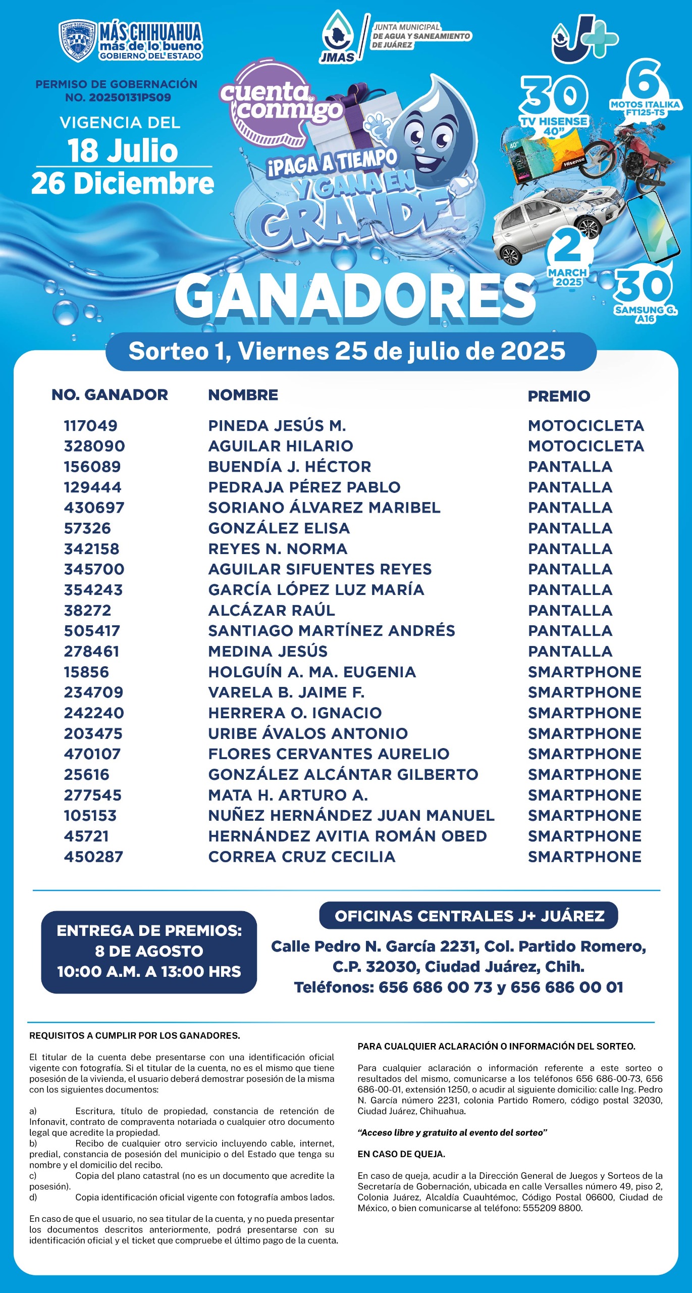 La entrega de los premios se realizará el próximo 8 de agosto, entre las 10:00 y las 13:00 horas, en las oficinas centrales de la Junta de Agua y Saneamiento de Juárez, ubicadas en la calle Pedro N. García 2231, colonia Partido Iglesias.