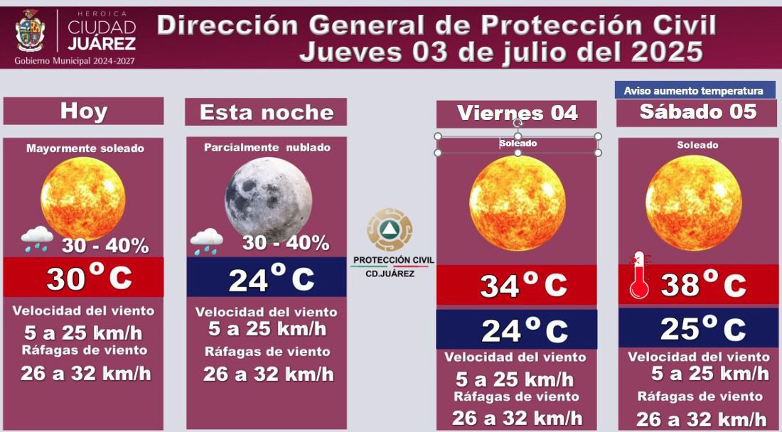 La Dirección General de Protección Civil informó el pronóstico del clima correspondiente al jueves 3 de julio de 2025 y los próximos días.