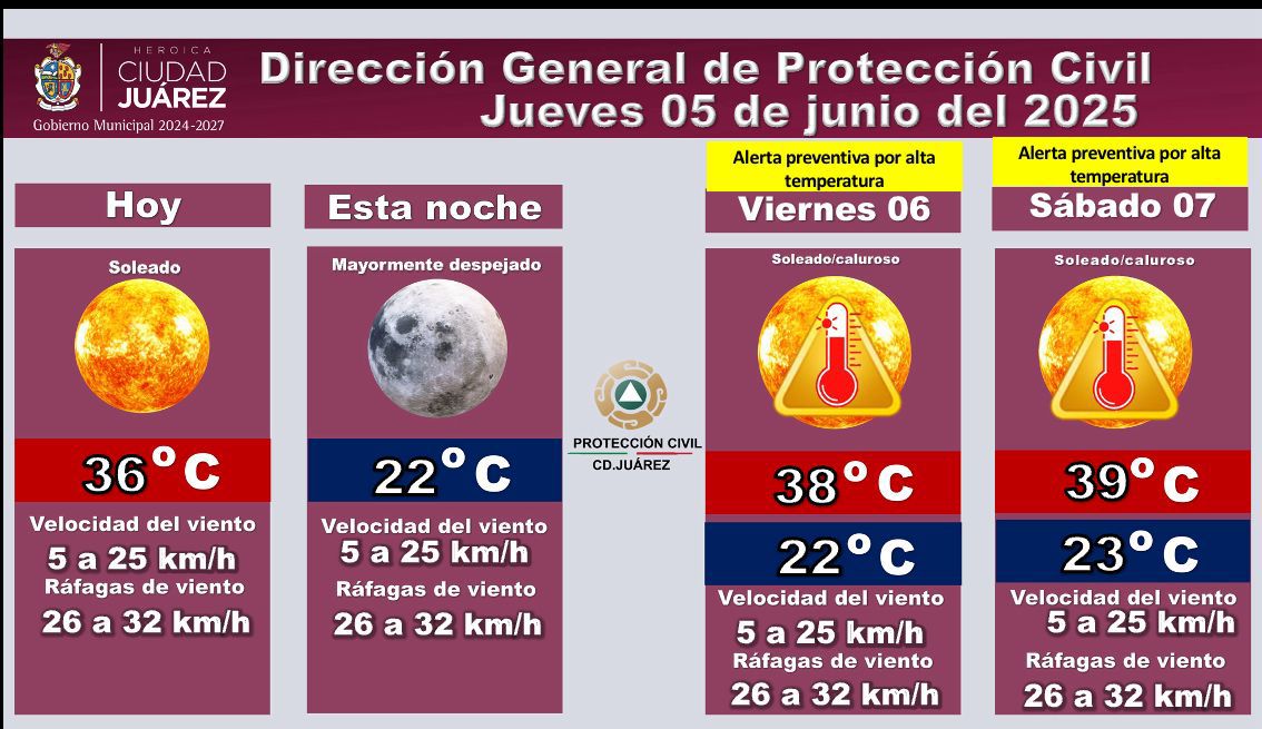 La Dirección General de Protección Civil informó sobre las condiciones climáticas previstas para los próximos días, destacando la emisión de una alerta preventiva por altas temperaturas para el viernes 6 y sábado 7 de junio.