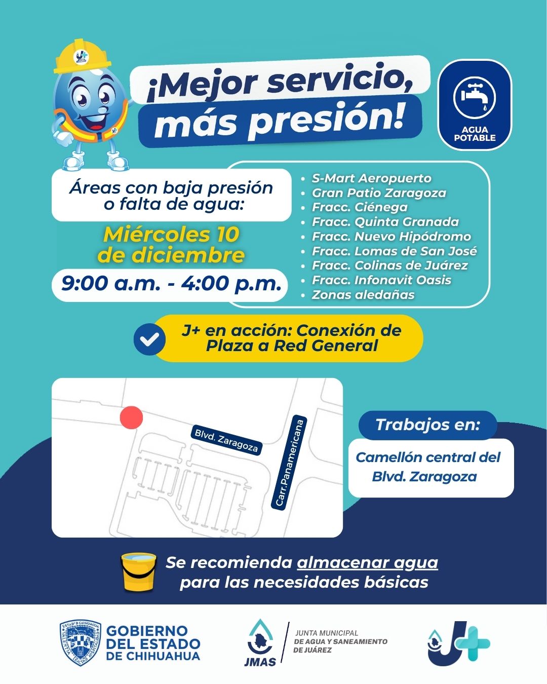 Por estas acciones, se registrará baja presión o falta del servicio en: S-Mart Aeropuerto, Gran Patio Zaragoza y los fraccionamientos: Ciénega, Quinta Granada, Nuevo Hipódromo, Lomas De San José, Colinas De Juárez, Infonavit Oasis y zonas aledañas.