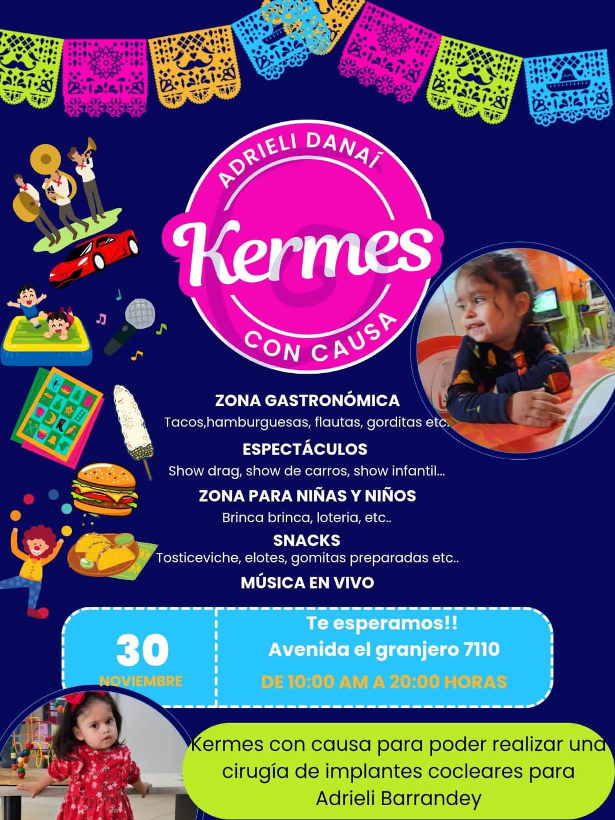 Ciudad Juárez, Chih.— La comunidad de los alrededores a la Av. El Granjero anuncia con orgullo la Tercera Edición del Festival El Granjero, que se realizará este domingo 30 de noviembre, de 10:00 a 20:00 horas, con un fin profundamente especial: ayudar a la pequeña Adrieli Danai, una niña de dos años que necesita una operación y tratamiento médico para poder escuchar.