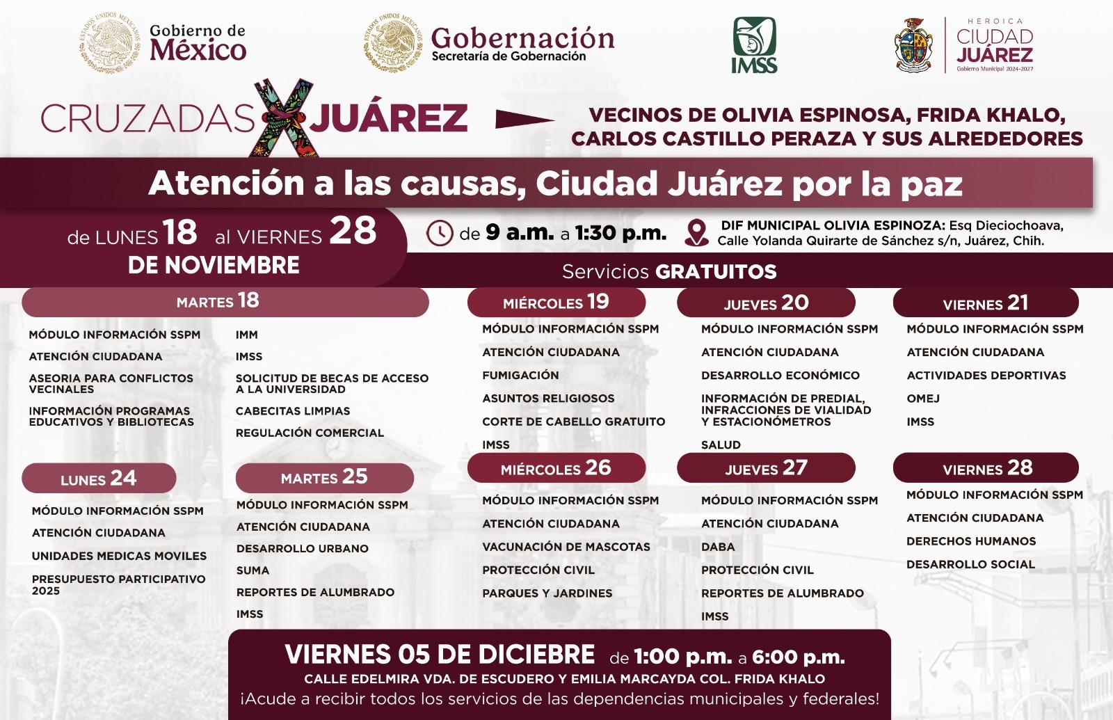 El próximo viernes 5 de diciembre se llevará a cabo el programa “Cruzadas por Juárez, Atención a las Causas, Ciudad Juárez por la Paz”, en la calle Edelmira Viuda de Escudero y Emilia Marcayda en la colonia Frida Kahlo de 1:00 a 6:00 de la tarde.