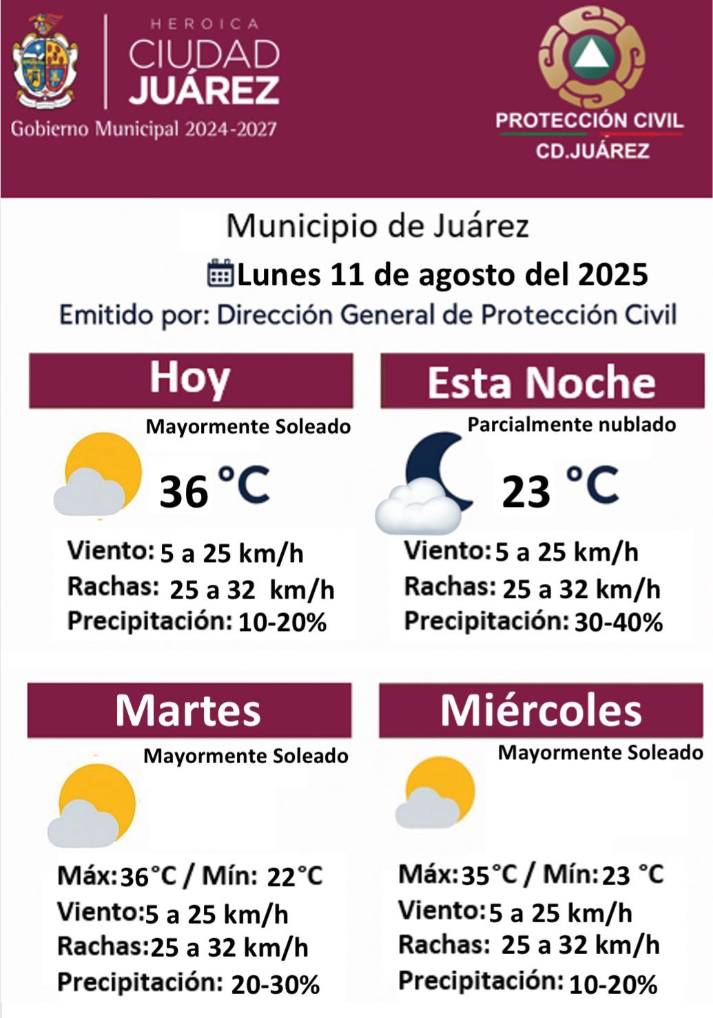 La Dirección General de Protección Civil informó el pronóstico del clima para este lunes 11 de agosto de 2025.