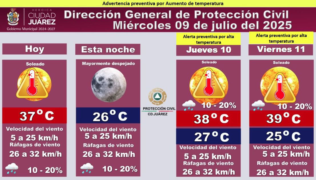 La Dirección General de Protección Civil del Municipio emitió una advertencia preventiva por aumento de temperatura, vigente desde este miércoles 9 de julio.