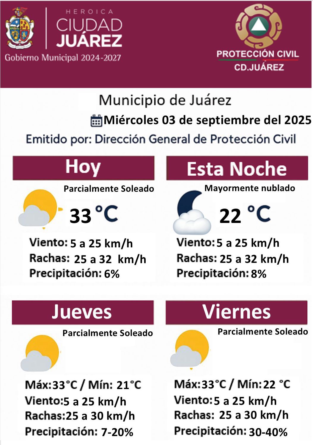 La Dirección General de Protección Civil del Municipio emitió el pronóstico del clima para este miércoles 3 de septiembre y los próximos días.