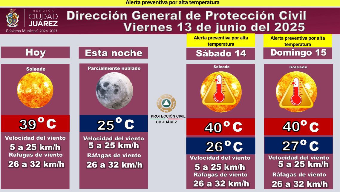 La Dirección General de Protección Civil emitió una alerta preventiva por alta temperatura para el fin de semana, que podría llegar a los 40 grados centígrados, de acuerdo con el pronóstico extendido desde este viernes 13 de junio.