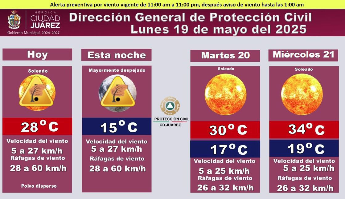 La Dirección General de Protección Civil emitió el pronóstico del clima para este lunes 19 de mayo, junto con una alerta preventiva por viento vigente de las 11:00 de la mañana a las 11:00 de la noche, y un aviso posterior que se extiende hasta la 1:00 de la madrugada.