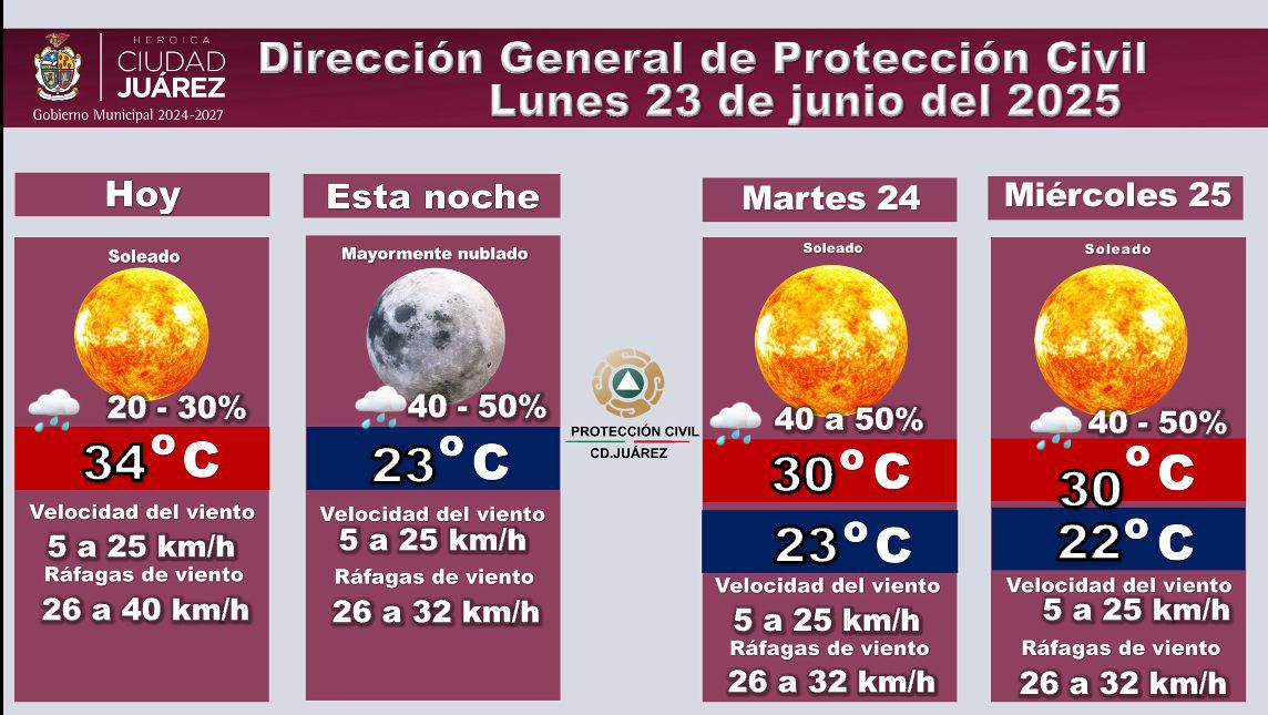 Para el miércoles 25 de junio también se anticipa un día soleado con una temperatura máxima de 30 grados Celsius y mínima de 22. La probabilidad de lluvia seguirá entre el 40 y 50 por ciento y se mantendrán las condiciones de viento similares a los días anteriores.