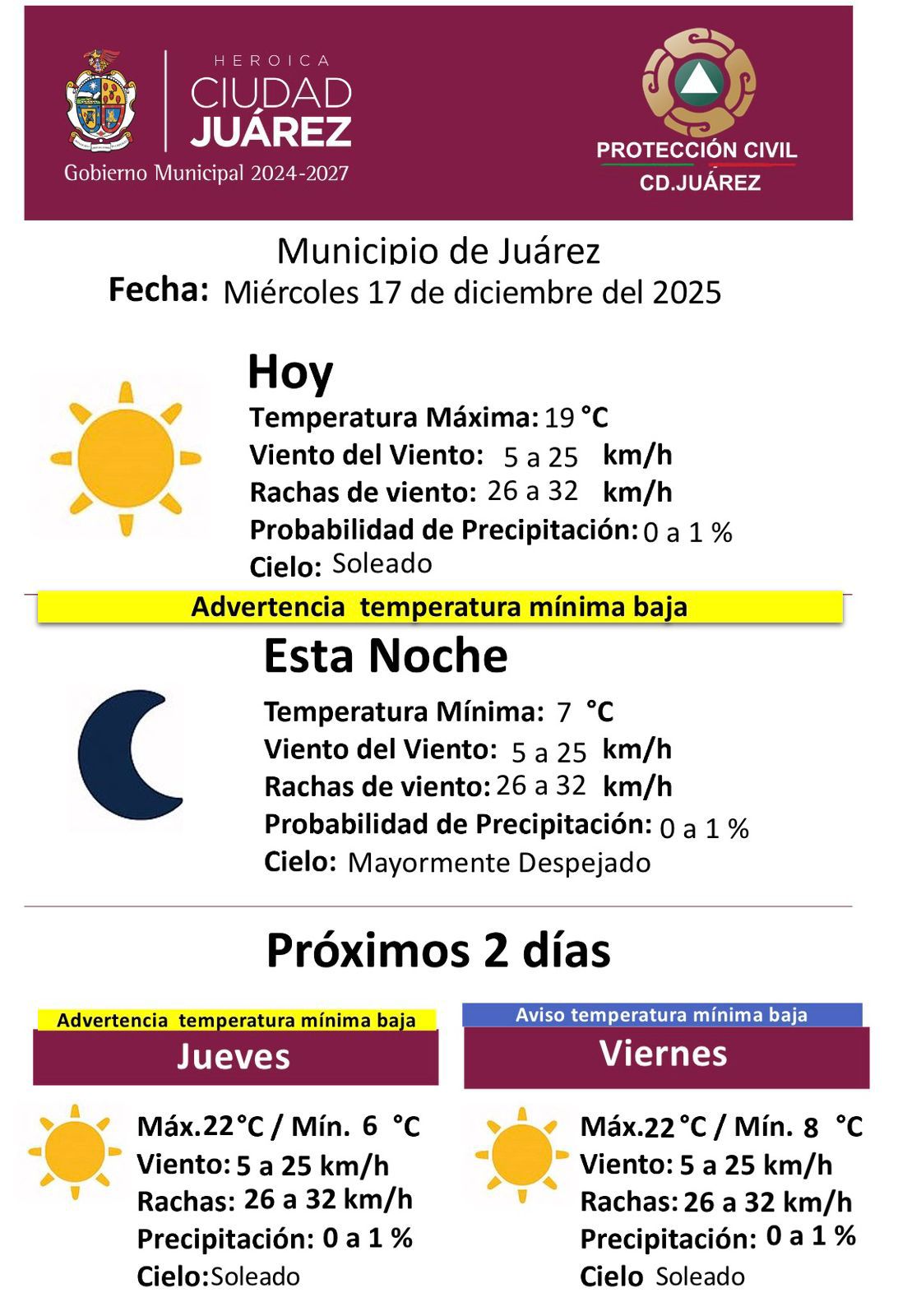 La Dirección General de Protección Civil del Municipio de Juárez informó el pronóstico del clima para este miércoles 17 de diciembre de 2025, en el que se esperan condiciones estables y cielo mayormente soleado, aunque con advertencia por temperaturas mínimas bajas, principalmente durante la noche y madrugada.