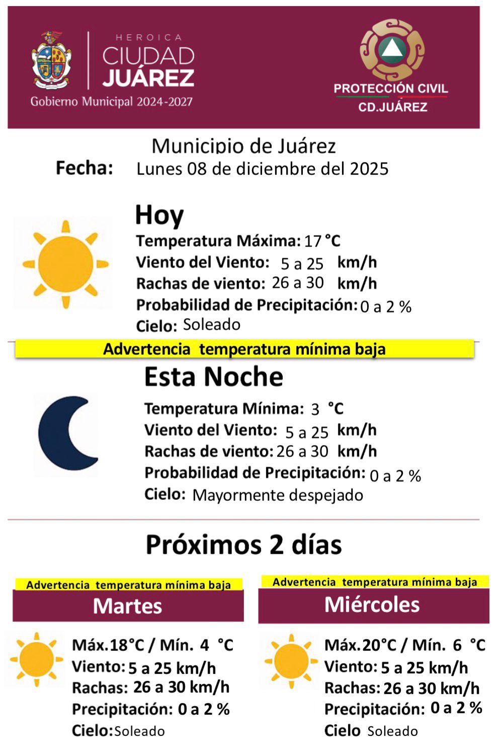 El Municipio de Juárez, a través de la Dirección General de Protección Civil, informó el pronóstico del clima correspondiente al lunes 08 de diciembre de 2025, advirtiendo nuevamente sobre condiciones de temperatura mínima baja durante la noche y madrugada.