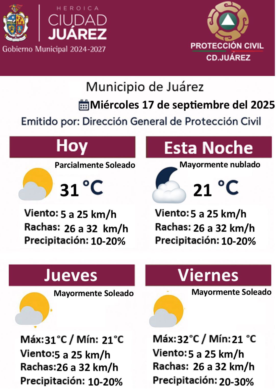 La Dirección General de Protección Civil del Municipio de Juárez informó sobre las condiciones climatológicas que se presentarán este miércoles 17 de septiembre de 2025 y durante los próximos días.