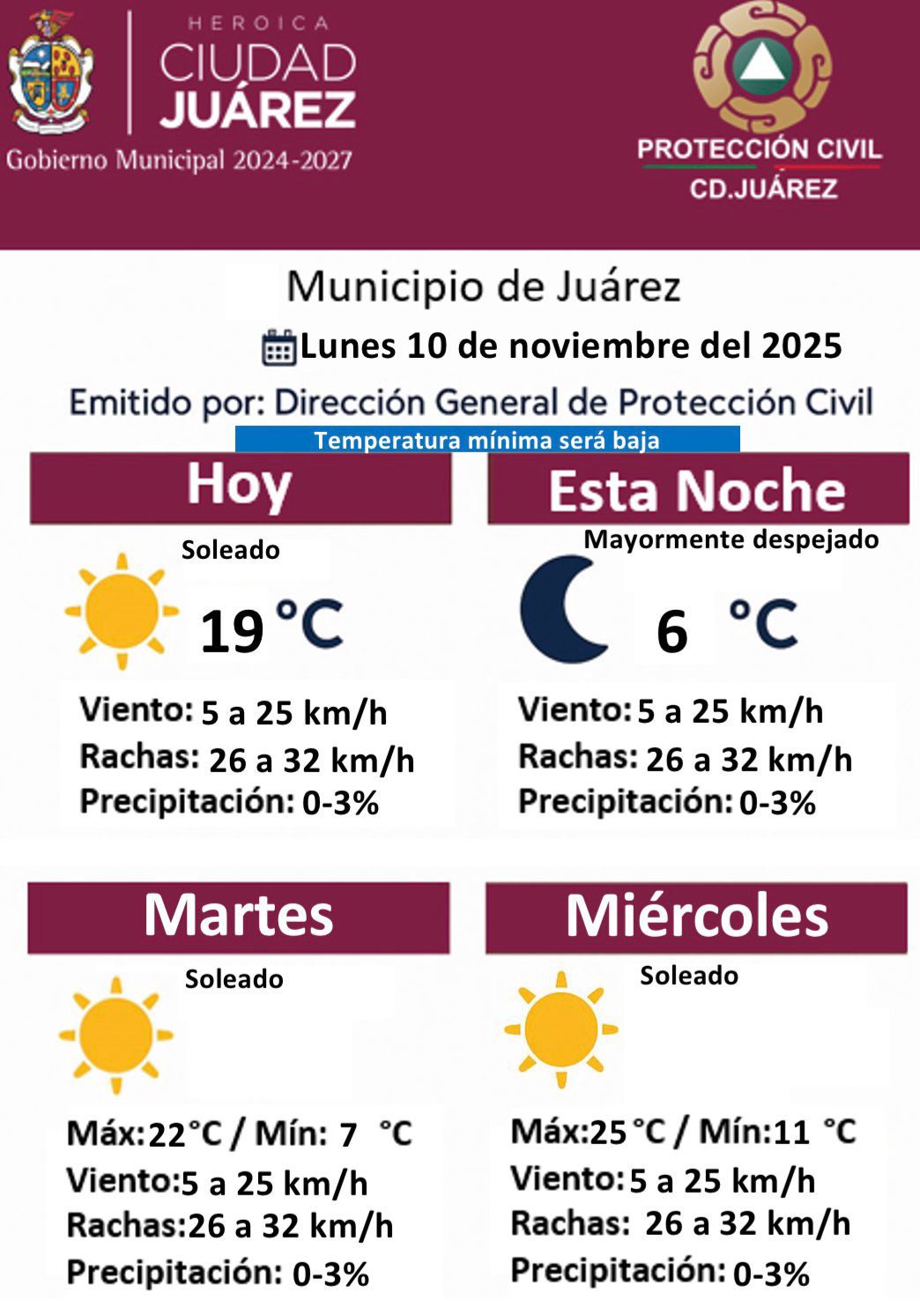 La Dirección General de Protección Civil del Municipio informó que este lunes 10 de noviembre se mantendrá un ambiente soleado con una temperatura máxima de 19 grados centígrados.