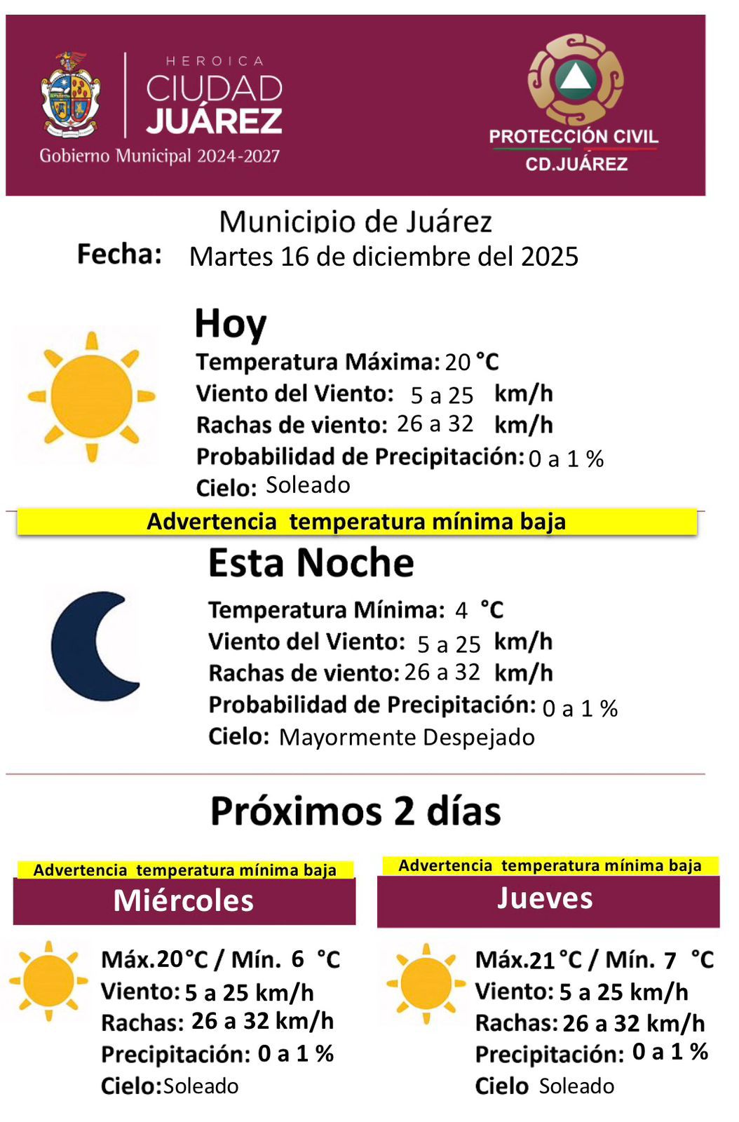 La Dirección General de Protección Civil del Municipio dio a conocer el pronóstico del clima para este martes 16 de diciembre, en el que se mantiene una advertencia por temperatura mínima baja.