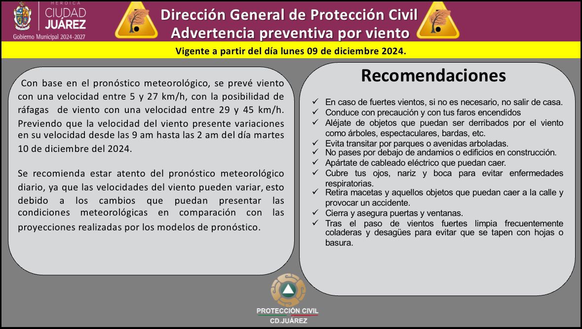 La Dirección General de Protección Civil de Ciudad Juárez informó que, a partir de.este lunes 9 de diciembre de 2024, estará vigente una advertencia preventiva por fuertes vientos. Según el pronóstico meteorológico, se espera que los vientos alcancen velocidades entre 5 y 27 km/h, con ráfagas que podrían variar de 29 a 45 km/h. Este fenómeno se registrará principalmente entre las 9:00 a.m. y las 2:00 a.m. del martes 10 de diciembre.