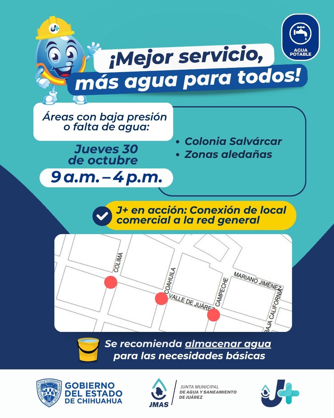 Debido a la conexión de una empresa a la red de agua potable de la Junta de Agua y Saneamiento de Juárez (J+), este jueves 30 de octubre se realizarán trabajos sobre la calle Valle de Juárez en la colonia Salvárcar, la cual tendrá baja presión o falta del servicio durante algunas horas.