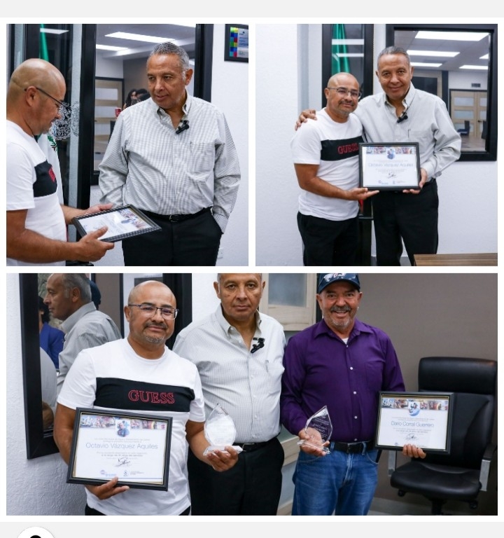 Sergio Nevárez, director ejecutivo de la Junta de Agua y Saneamiento de Juárez, entregó este lunes reconocimientos a Octavio Vázquez y Darío Corral Guerrero, dos empleados que se jubilan después de prestar sus servicios a este organismo durante aproximadamente tres décadas.