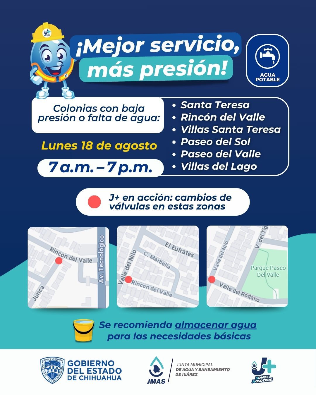 Las colonias y fraccionamientos que tendrán baja presión o falta de agua durante este lunes serán: Santa Teresa, Rincón del Valle, Villas Santa Teresa, Paseo del Sol, Paseo del Valle y Villas del Lago, por lo que la J+ exhorta a los residentes de estas zonas a prepararse y hacer acopio de agua para cubrir sus necesidades básicas durante el día.