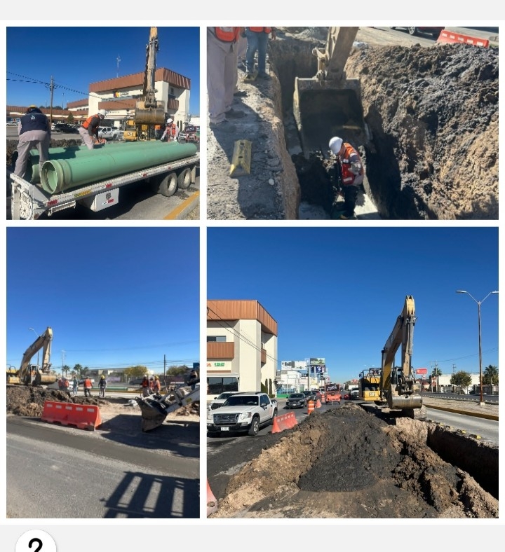 Cuadrillas de la Junta de Agua y Saneamiento de Juárez (J+) atendieron de manera inmediata el hundimiento registrado la tarde del sábado en el cruce de la avenida Tecnológico y calle Aguirre Laredo.