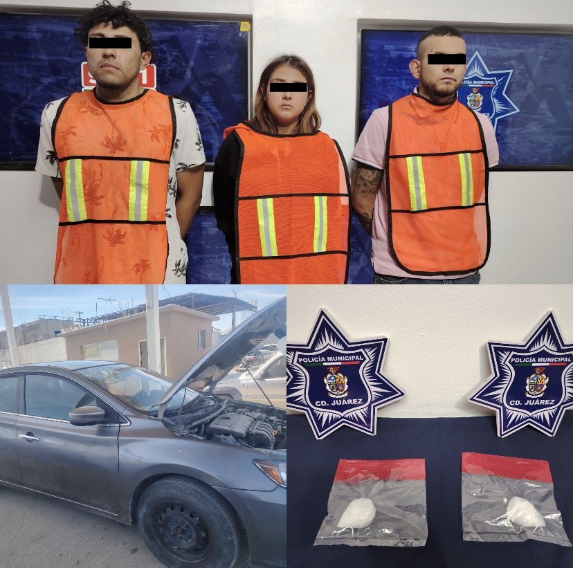 Agentes de la Secretaría de Seguridad Pública Municipal arrestaron a Gael L. D., Jonathan Gabriel C. E. y Diana Paola G. G., por su presunta responsabilidad en la comisión del delito de posesión de vehículo con pre denuncia de robo y delitos contra la salud.