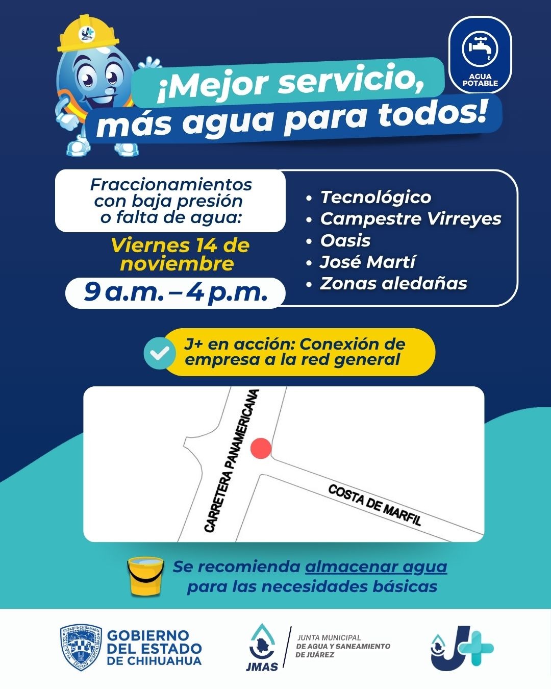 Este viernes 14 de noviembre, la Junta de Agua y Saneamiento de Juárez conectará una empresa a la red general, lo cual provocará la suspensión del servicio, afectando varias colonias cercanas al cruce de la avenida Tecnológico y el bulevar Zaragoza.