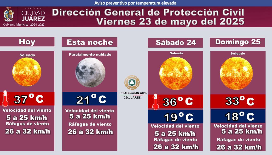De acuerdo con el pronóstico, este viernes se espera un día soleado con una temperatura máxima de 37 grados Celsius y mínima de 21 grados durante la noche, la cual se presentará parcialmente nublada. Los vientos oscilarán entre los 5 y 25 kilómetros por hora, con ráfagas de hasta 32 kilómetros por hora.